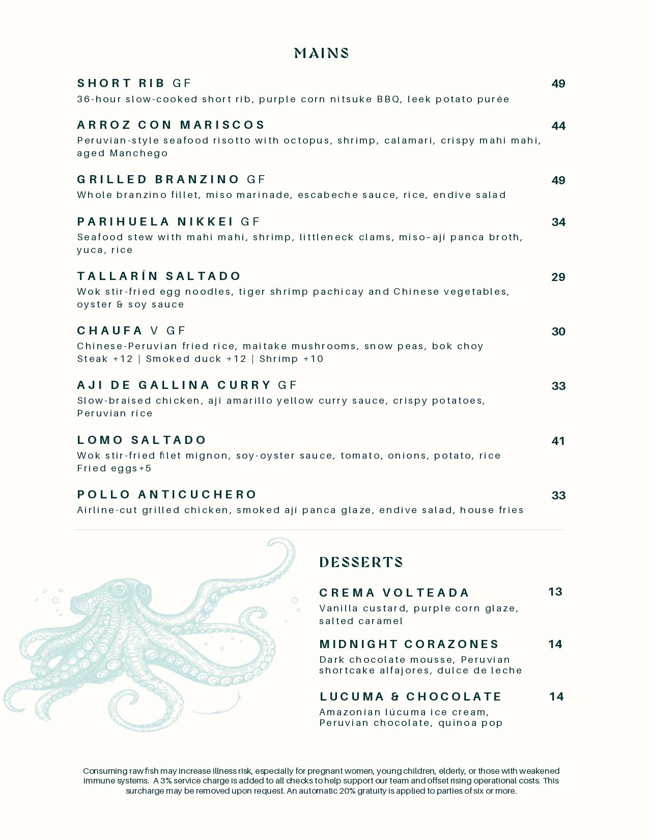 Consuming raw fish may increase iliness risk, especially for pregnant women, young children, elderly, or those with weakened immune system. A 3% surcharge is applied to every check to support our staff ans rising operational cost.